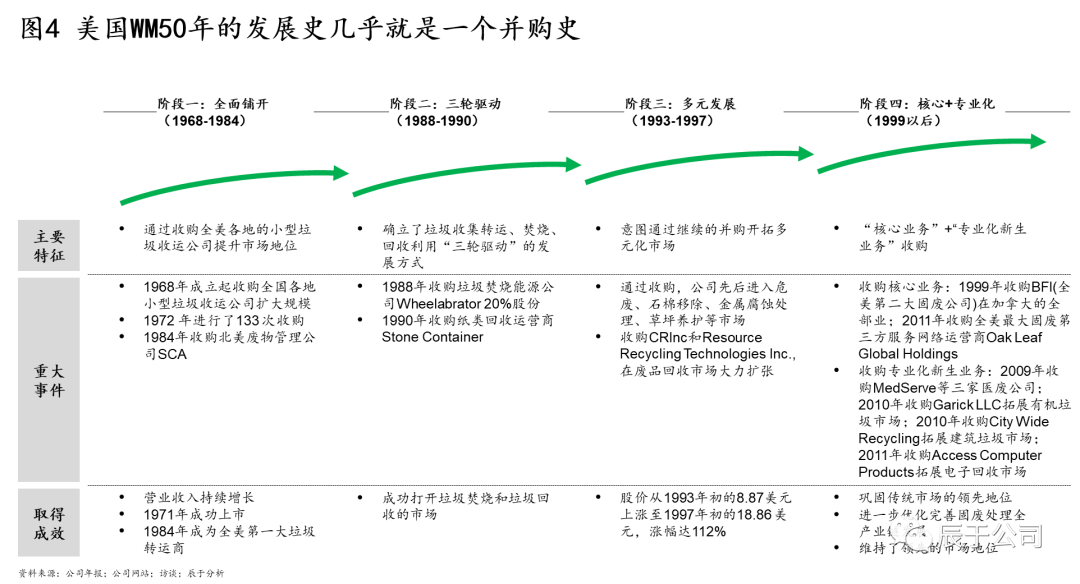 美國WM的50年發(fā)展幾乎就是一個并購史,可分為四個階段(見圖4):1968~1984年全面鋪開階段,通過收購全美各地的小型垃圾收運公司提升市場地位,其中1972 年就進行了133 次收購,1984年收購北美廢物管理公司SCA之后,成為全美第一大垃圾運轉(zhuǎn)商;1988~1990年三輪驅(qū)動階段,確立了垃圾收集轉(zhuǎn)運、焚燒、回收利用“三輪驅(qū)動”的發(fā)展方式,通過并購垃圾焚燒能源公司W(wǎng)heelabrator和紙類回收運營商Stone Container等手段實現(xiàn);1993~1997年多元發(fā)展階段,WM意圖通過大舉并購開拓多元化市場,通過收購先后進入危廢、石棉移除、金屬腐蝕處理、草坪養(yǎng)護等市場,股價從1993年初的8.87美元上漲至1997年初的18.86 美元,漲幅達112%(不過事后證明這個階段的過度多元化并購是失敗的);1999年以后WM開始專注在核心業(yè)務+專業(yè)化新生業(yè)務的并購,其中核心業(yè)務收購了BFI(全美第二大固廢公司)在加拿大的全部業(yè)務和全美最大固廢第三方服務網(wǎng)絡運營商Oak Leaf Global Holdings,這些并購不僅鞏固了WM傳統(tǒng)市場的領(lǐng)先地 U7Y位,也完善了固廢處理全產(chǎn)業(yè)鏈布局。