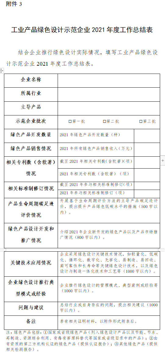 3.工業(yè)產(chǎn)品綠色設(shè)計(jì)示范企業(yè)2021年度工作總結(jié)表