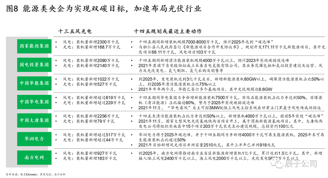 值得關(guān)注的是,為實(shí)現(xiàn)碳達(dá)峰碳中和,能源類央企加速布局光伏行業(yè),目標(biāo)宏大:例如國(guó)家能投集團(tuán)計(jì)劃“十四五”期間新增裝機(jī)規(guī)模7000-8000萬千瓦,預(yù)計(jì)2025年實(shí)現(xiàn)碳達(dá)峰;國(guó)電投資集團(tuán)則計(jì)劃“十四五”期間新增清潔能源裝機(jī)規(guī)模4000萬千瓦以上,預(yù)計(jì)2023年實(shí)現(xiàn)碳達(dá)峰(見圖8)。