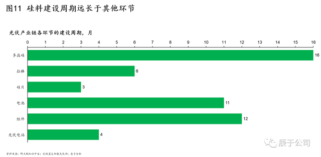 二是建設(shè)周期不同。硅料建設(shè)周期一般長(zhǎng)達(dá)16個(gè)月,組件、電池、拉棒、光伏電站、硅片則分別為12、11、6、4、3個(gè)月,由于建設(shè)周期差異較大,供需錯(cuò)配的問題時(shí)有發(fā)生(見圖11)。