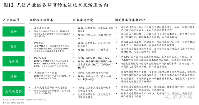 往前看,技術(shù)迭代仍在快速推進(jìn),例如硅片就剛剛經(jīng)歷過P型單晶硅片替代多晶硅片的過程,其市場(chǎng)占有率從2016年的20%,短短四年間就提升至2020年底的90%以上;隨之而來的是,大尺寸的N型單晶硅片的概念又被提出,由于發(fā)電效率更高、終端產(chǎn)品的非硅成本(生產(chǎn)中所消耗的能源、人力、輔料等)更低,想必又將帶來新一輪產(chǎn)品迭代風(fēng)潮(見圖13)。
