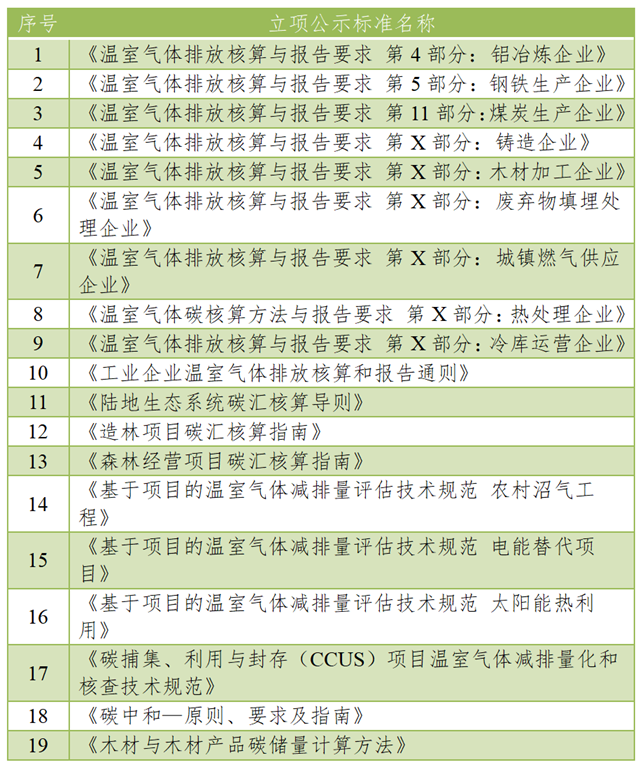 國家市場監(jiān)督管理總局對《溫室氣體排放核算與報(bào)告要求 第4部分:鋁冶煉企業(yè)》等10項(xiàng)溫室氣體碳核算標(biāo)準(zhǔn),《陸地生態(tài)系統(tǒng)碳匯核算導(dǎo)則》等3項(xiàng)碳匯核算標(biāo)準(zhǔn),《基于項(xiàng)目的溫室氣體減排量評估技術(shù)規(guī)范 農(nóng)村沼氣工程》等4項(xiàng)碳減排標(biāo)準(zhǔn),以及《碳中和—原則、要求及指南》《木材與木材產(chǎn)品碳儲量計(jì)算方法》等標(biāo)準(zhǔn)進(jìn)行立項(xiàng)公示。具體見下表。