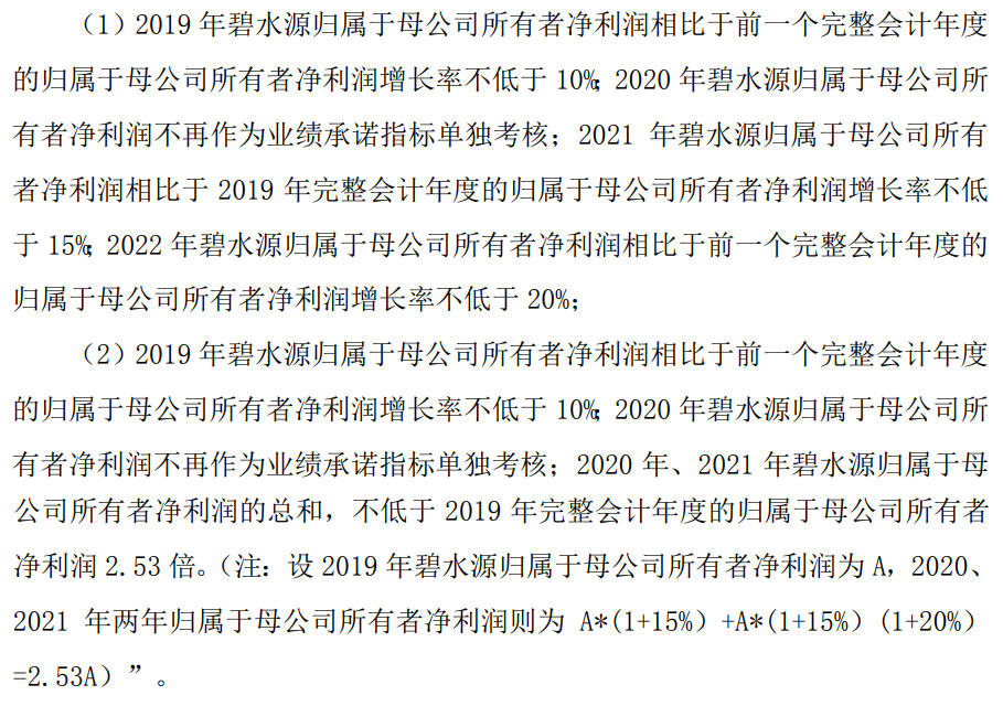 文劍平等4人為何會背上業(yè)績承諾的包袱,還要從2018年說起。2018年,受PPP暴雷潮影響,環(huán)保產(chǎn)業(yè)出現(xiàn)一輪融資貴、融資難問題,東方園林、碧水源、博天環(huán)境等大批民營環(huán)保企業(yè)都出現(xiàn)了資金鏈危機。為了自救,多家企業(yè)紛紛轉(zhuǎn)讓股權(quán),投入國資的懷抱。碧水源也于2019年6月被中國城鄉(xiāng)收購了10.18%的股份,成為公司的第二大股東。而在當初轉(zhuǎn)讓時,雙方曾經(jīng)約定了一個業(yè)績承諾條款,內(nèi)容如下:2019年公司歸屬于母公司所有者凈利潤相比于前一個完整會計年度的歸屬于母公司所有者凈利潤增長率不低于10%,2020年公司歸屬于母公司所有者凈利潤相比于前一個完整會計年度的歸屬于母公司所有者凈利潤增長率不低于15%,2021年公司歸屬于母公司所有者凈利潤相比于前一個完整會計年度的歸屬于母公司所有者凈利潤增長率不低于20%。