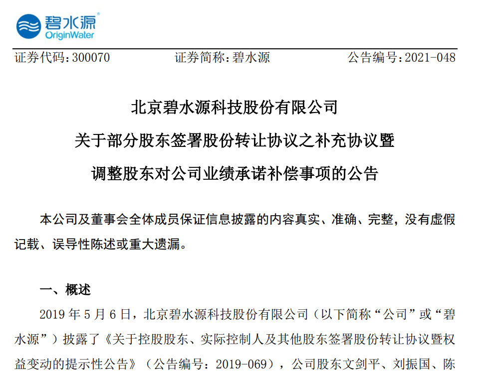 6、《關于部分股東簽署股份轉(zhuǎn)讓協(xié)議之補充協(xié)議暨調(diào)整股東對公司業(yè)績承諾事項的公告》,碧水源,2021-03-31
