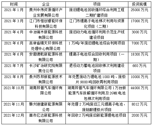 圖二:2021年部分電池回收企業(yè)投資情況