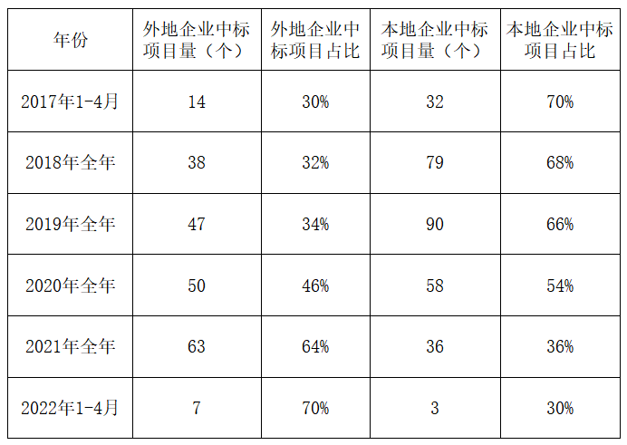 這里所說的本地企業(yè),是指項目中標公司注冊地在本省的企業(yè),反之,則成為外地企業(yè)。如北京環(huán)境有限公司在北京市中標項目,就是本地企業(yè),在貴州省中標項目,就是外地企業(yè)。