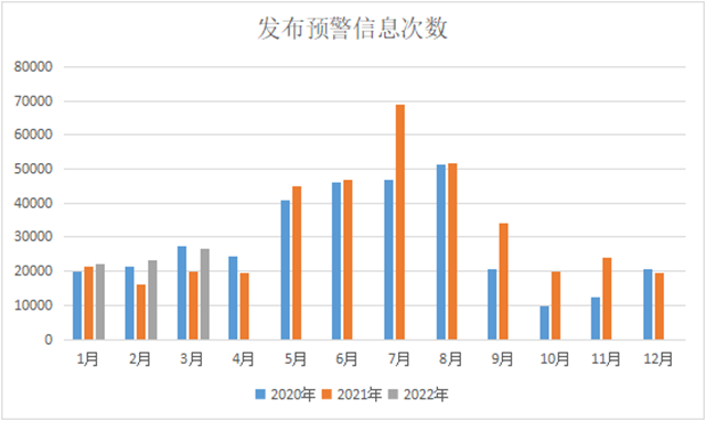依照《國(guó)家突發(fā)事件預(yù)警信息發(fā)布情況月報(bào)》,綜合對(duì)比2020年1月——2022年3月數(shù)據(jù)信息可知,全國(guó)各部門通過國(guó)家預(yù)警發(fā)布系統(tǒng)發(fā)布預(yù)警信息高點(diǎn)主要集中在5月——8月,表明夏季污染率更高;研究表明夏季的陽光輻射致使臭氧常成為多地居高不下的首要污染物。