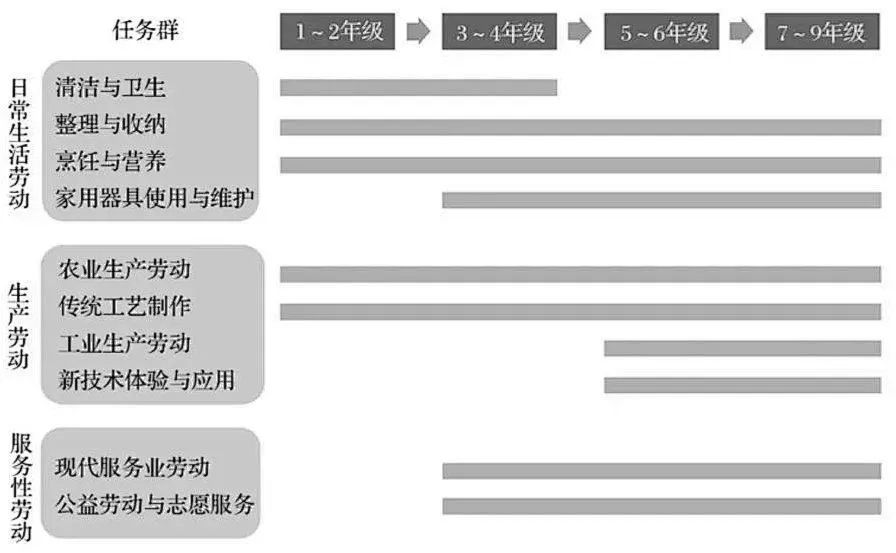 生產(chǎn)勞動:農(nóng)業(yè)生產(chǎn)勞動、傳統(tǒng)工藝制作、工業(yè)生產(chǎn)勞動、新技術(shù)體驗與應(yīng)用四個任務(wù)群。