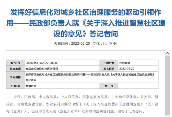 近日,民政部、中央政法委、中央網信辦、國家發(fā)展改革委、工業(yè)和信息化部、公安部、財政部、住房城鄉(xiāng)建設部、農業(yè)農村部聯(lián)合印發(fā)了《關于深入推進智慧社區(qū)建設的意見》(以下簡稱《意見》)。民政部負責人就《意見》起草印發(fā)和貫徹落實等問題,回答了記者提問。