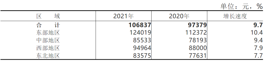 2021年規(guī)模以上企業(yè)就業(yè)人員年平均工資情況2021年全國規(guī)模以上企業(yè)就業(yè)人員年平均工資為88115元,比上年名義增長10.3%。其中,中層及以上管理人員180630元,增長9.5%;專業(yè)技術(shù)人員125035元,增長11.1%;辦事人員和有關(guān)人員82512元,增長9.8%;社會生產(chǎn)服務(wù)和生活服務(wù)人員68022元,增長9.8%;生產(chǎn)制造及有關(guān)人員68506元,增長9.4%。中層及以上管理人員平均工資最高,是全部就業(yè)人員平均水平的2.05倍;社會生產(chǎn)服務(wù)和生活服務(wù)人員平均工資最低,是全部就業(yè)人員平均水平的77%。崗位平均工資最高與最低之比為2.66,與上年持平。 分區(qū)域看,五類崗位平均工資最高的區(qū)域均為東部,平均工資分別為中層及以上管理人員210100 元、專業(yè)技術(shù)人員143786元、辦事人員和有關(guān)人員93353元、社會生產(chǎn)服務(wù)和生活服務(wù)人員74762元、生產(chǎn)制造及有關(guān)人員71576元。五類崗位平均工資最低的區(qū)域均為中部,分別為127581元、89112元、63509元、54365元和61288元。表1 2021年分區(qū)域分崗位就業(yè)人員年平均工資
