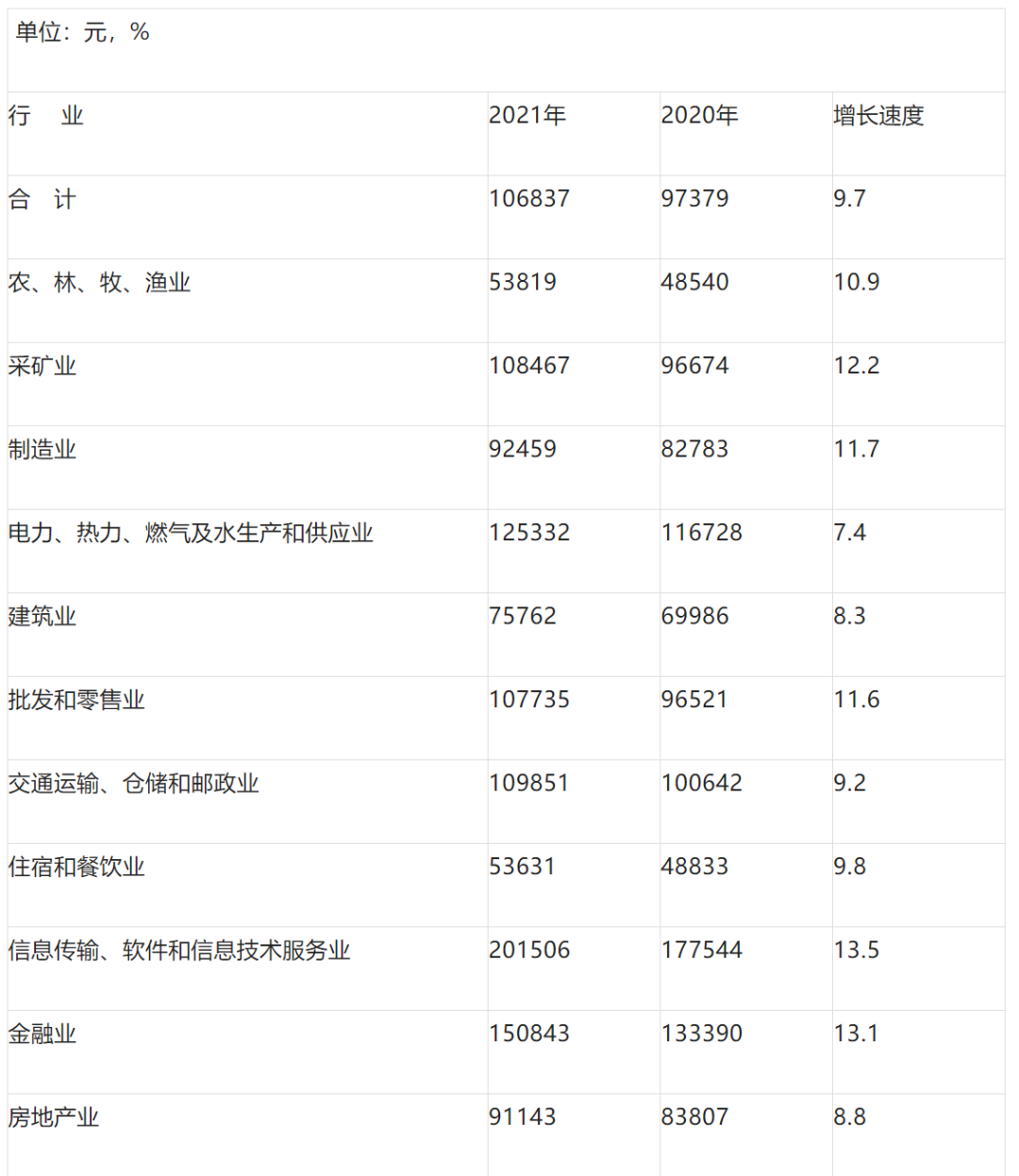 2021年全國城鎮(zhèn)非私營單位就業(yè)人員年平均工資為106837元,比上年增加9458元,名義增長9.7%,增速比2020年提高2.1個百分點??鄢齼r格因素,2021年全國城鎮(zhèn)非私營單位就業(yè)人員年平均工資實際增長8.6%。
