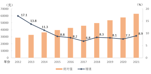 2012-2021年城鎮(zhèn)非私營單位就業(yè)人員年平均工資及增速
