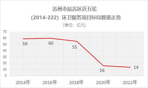 2014年59個標段(開標57個標段,金閶十標段、十四標段廢標),2016年60個標段,2018年55個標段,2020年16個標段,2022年14個標段。