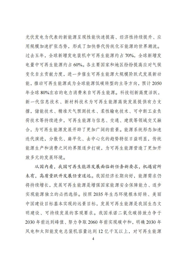 為深入貫徹“四個(gè)革命、一個(gè)合作”能源安全新戰(zhàn)略,落實(shí)碳達(dá)峰、碳中和目標(biāo),推動可再生能源產(chǎn)業(yè)高質(zhì)量發(fā)展,根據(jù)《中華人民共和國國民經(jīng)濟(jì)和社會發(fā)展第十四個(gè)五年規(guī)劃和2035年遠(yuǎn)景目標(biāo)綱要》和《“十四五”現(xiàn)代能源體系規(guī)劃》有關(guān)要求,我們組織編制了《“十四五”可再生能源發(fā)展規(guī)劃》。現(xiàn)印發(fā)給你們,請遵照執(zhí)行。