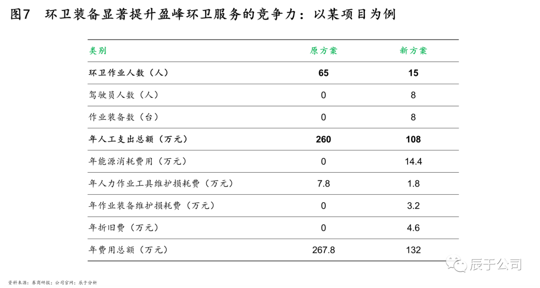 一方面,通過自有環(huán)衛(wèi)裝備優(yōu)勢強(qiáng)化環(huán)衛(wèi)服務(wù)拿單能力。以某項目為例,傳統(tǒng)環(huán)衛(wèi)項目方案年費(fèi)用總額為267.8萬元,相比之下,盈峰涉及的機(jī)械化新方案僅為132萬元,年度總費(fèi)用投入消減50.7%,作業(yè)人員隊伍精簡64.6%(見圖7)。