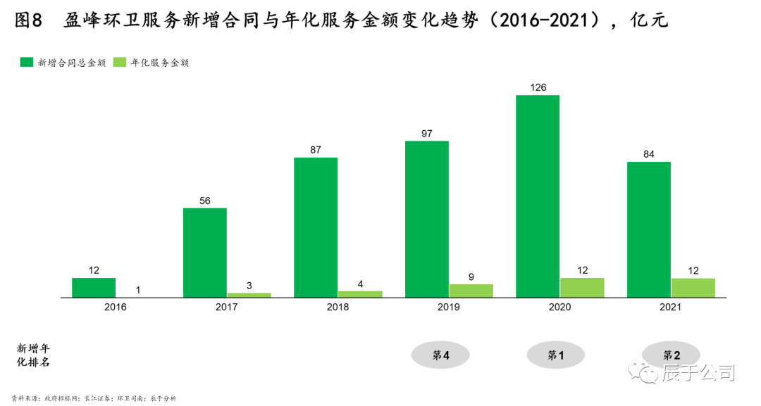 上述“裝備帶動服務(wù)”的業(yè)務(wù)協(xié)同戰(zhàn)略成效顯著,盈峰接連斬獲多個大型環(huán)衛(wèi)項目,如78億的深圳市寶安區(qū)環(huán)衛(wèi)一體化PPP項目、10.3億的淮北市環(huán)衛(wèi)一體化特許經(jīng)營項目等。憑著“拿大單”“拿明星項目”,盈峰的環(huán)衛(wèi)服務(wù)業(yè)務(wù)發(fā)展迅速,近年來在環(huán)衛(wèi)業(yè)務(wù)市場的地位也有了顯著提升(見圖8)。增量來看,2020年,盈峰環(huán)境環(huán)衛(wèi)服務(wù)新增合同總額、新增年化合同額均位列全國前列;存量來看,截至2021年,盈峰環(huán)境運(yùn)營的環(huán)衛(wèi)服務(wù)項目累計合同總額達(dá)到459億,待執(zhí)行合同總額達(dá)383億,位居行業(yè)前三,可持續(xù)經(jīng)營能力名列前茅。