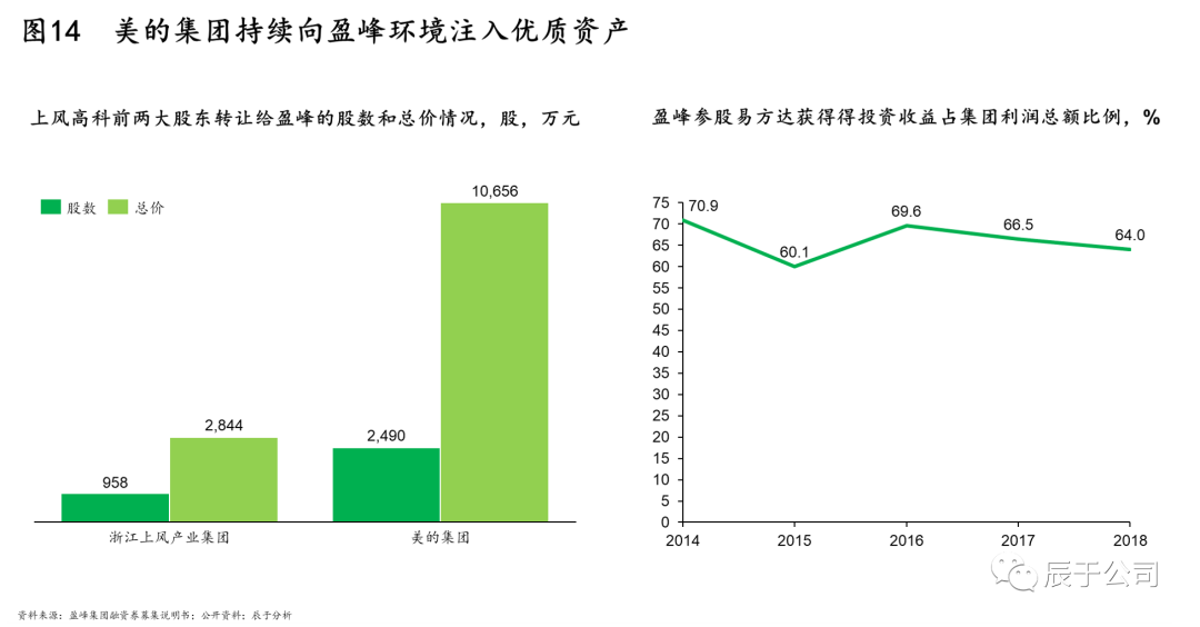三是資本運(yùn)作方面。美的集團(tuán)持續(xù)多年向盈峰環(huán)境注入旗下優(yōu)質(zhì)資產(chǎn),為盈峰早期的規(guī)模擴(kuò)張?zhí)峁┝舜罅χС?。?006年2月,上風(fēng)高科前兩大股東浙江上風(fēng)產(chǎn)業(yè)集團(tuán)及美的集團(tuán)將其各自持有公司的法人股轉(zhuǎn)讓給盈峰集團(tuán),從每股價格來看,在入主兩年多后,美的集團(tuán)僅僅按原價轉(zhuǎn)讓,并沒取得投資收益,可謂原價轉(zhuǎn)手;而對于盈峰而言,這是其體系內(nèi)的首家上市公司,為公司未來發(fā)展發(fā)揮了至關(guān)重要的作用。又如2007年4月,美的以1.65億元的價格向盈峰集團(tuán)轉(zhuǎn)讓易方達(dá)基金25%股權(quán),易方達(dá)成為盈峰金融板塊的主要成員,自此,盈峰從易方達(dá)獲得的投資收益多年來占到公司利潤總額的60%以上(見圖14)。