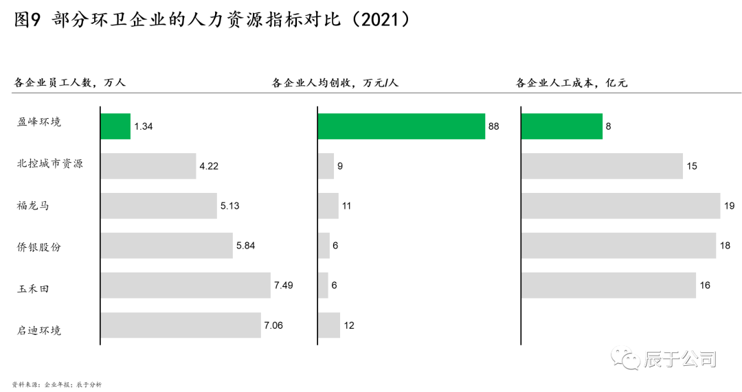 此外,這一模式也讓盈峰環(huán)境跳出了“環(huán)衛(wèi)企業(yè)=人多、人均創(chuàng)收低、技術(shù)含量低”的傳統(tǒng)環(huán)衛(wèi)企業(yè)形象。眾所周知,傳統(tǒng)環(huán)衛(wèi)屬勞動密集產(chǎn)業(yè),企業(yè)多以人員投入多、人均創(chuàng)收低、技術(shù)投入低等模式運(yùn)營,機(jī)械化程度不足。而盈峰憑借裝備領(lǐng)域積累的技術(shù)優(yōu)勢,在包括兩大深圳項目在內(nèi)的眾多項目運(yùn)營中,應(yīng)用了自主研發(fā)的全球首批智能小型環(huán)衛(wèi)機(jī)器人編隊,大大提升項目機(jī)械化率,也使項目的人均產(chǎn)值顯著攀升(見圖9)。
