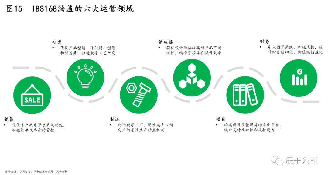 四是管理賦能方面。美的不斷將自身在家電領(lǐng)域的豐富經(jīng)驗賦能給盈峰環(huán)境,例如,盈峰環(huán)境2019年提出IBS168計劃,正是以美的水準(zhǔn)打造的數(shù)字化管理系統(tǒng)。該系統(tǒng)的IBS指Infore Business System,構(gòu)建了以市場、客戶為導(dǎo)向的新型訂單預(yù)定模式,建立了內(nèi)外協(xié)同價值鏈的運(yùn)營體系,覆蓋研發(fā)、營銷、供應(yīng)鏈、財務(wù)、項目、服務(wù)6大運(yùn)營領(lǐng)域(見圖15),包含產(chǎn)品生命周期、客戶關(guān)系、供應(yīng)商關(guān)系、制造執(zhí)行、企業(yè)資源、設(shè)備管理、組織管理、彈性制造8大管理體系。系統(tǒng)的目的是推動全業(yè)務(wù)的數(shù)字化轉(zhuǎn)型,通過建立數(shù)字化精益制造管理體系,達(dá)到產(chǎn)銷、產(chǎn)研的高效對接并實現(xiàn)降本增效,應(yīng)用于盈峰的環(huán)衛(wèi)裝備、環(huán)衛(wèi)服務(wù)和其他固廢等業(yè)務(wù)。