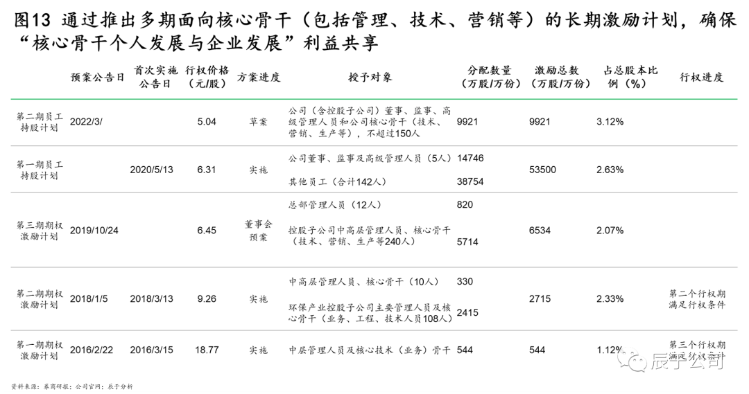 二是政策機(jī)制支持方面。盈峰環(huán)境引入美的經(jīng)驗,通過推出多期面向核心骨干(包括管理、技術(shù)、營銷等)的長期激勵計劃,確保“核心骨干個人發(fā)展與企業(yè)發(fā)展”利益共享(見圖13)。