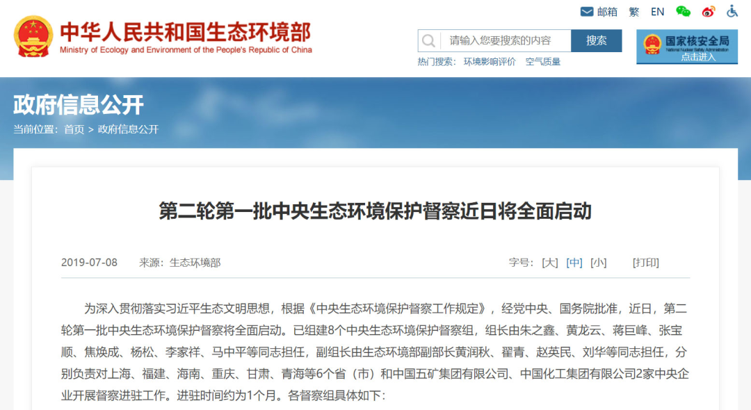 2019年7月,為深入貫徹落實(shí)習(xí)近平生態(tài)文明思想,根據(jù)《中央生態(tài)環(huán)境保護(hù)督察工作規(guī)定》,經(jīng)黨中央、國(guó)務(wù)院批準(zhǔn),第二輪第一批中央生態(tài)環(huán)境保護(hù)督察全面啟動(dòng)。
