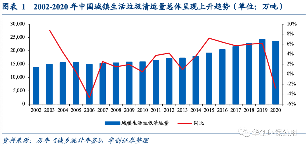 2020年中國城鎮(zhèn)生活垃圾清運量15年來首次下降。自2020年新冠疫情爆發(fā)以來,國內(nèi)正常的社會生產(chǎn)生活秩序受到一定程度影響,民眾消費不振也使生活垃圾清運量出現(xiàn)一定程度的下滑。依據(jù)2021年10月發(fā)的《2020城鄉(xiāng)建設(shè)統(tǒng)計年鑒》,2020年我國城鎮(zhèn)生活垃圾清運量為2.35億噸較2019年下降2.87%,這也是自2006年以來中國城鎮(zhèn)生活垃圾清運量首次呈現(xiàn)下降趨勢。