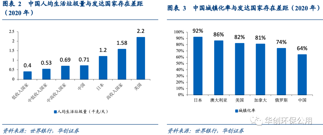 伴隨經(jīng)濟發(fā)展以及居民生活水平的提升,城鎮(zhèn)人均產(chǎn)生垃圾量也將隨之提升。我們選取第六次(2010)和第七次人口普查(2020)的城鎮(zhèn)人口數(shù)據(jù),計算得出2010年我國城鎮(zhèn)人均垃圾清運量為0.65千克/天,2020年這一數(shù)字已升至0.71千克/天,同期我國的城鎮(zhèn)化率由49.7%提升至63.9%,然而這兩項數(shù)據(jù)與發(fā)達國家均存在一定差距。根據(jù)世界銀行報告《2050年全球固體廢物管理一覽》的統(tǒng)計,高收入國家的人均生活垃圾量均值為1.58千克/天,美國更是達到了2.2千克/天,是我國的三倍;我國約64%的城鎮(zhèn)化率與發(fā)達國家普遍80%以上的城鎮(zhèn)化率相比差距明顯,與部分發(fā)展中國家70%以上的城鎮(zhèn)化率相比,也尚存一定提升空間。
