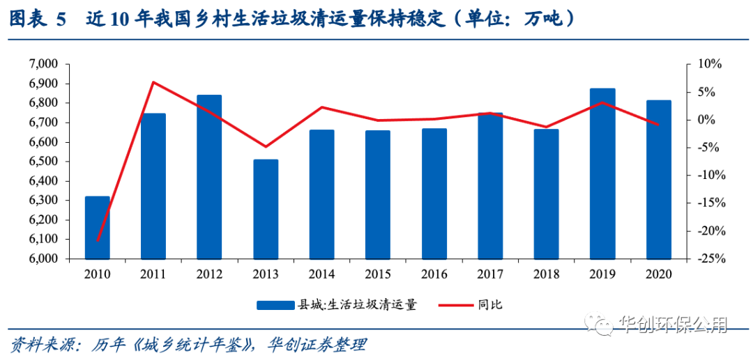 根據(jù)《2020城鄉(xiāng)建設(shè)統(tǒng)計年鑒》,農(nóng)村地區(qū)現(xiàn)每年產(chǎn)生垃圾總量穩(wěn)定在6600萬噸以上,人均垃圾產(chǎn)生量穩(wěn)定處于0.3千克/天的水平。相比城市而言,農(nóng)村的垃圾產(chǎn)生規(guī)模和人均垃圾產(chǎn)生量遠遠偏低,雖然存在鄉(xiāng)村人口萎縮的情況,但由于農(nóng)村地區(qū)垃圾收集、處置率存在較大的提高空間,依靠對未處理的垃圾存量的消化和擴大處理覆蓋,未來農(nóng)村垃圾處理規(guī)模的擴張可期。