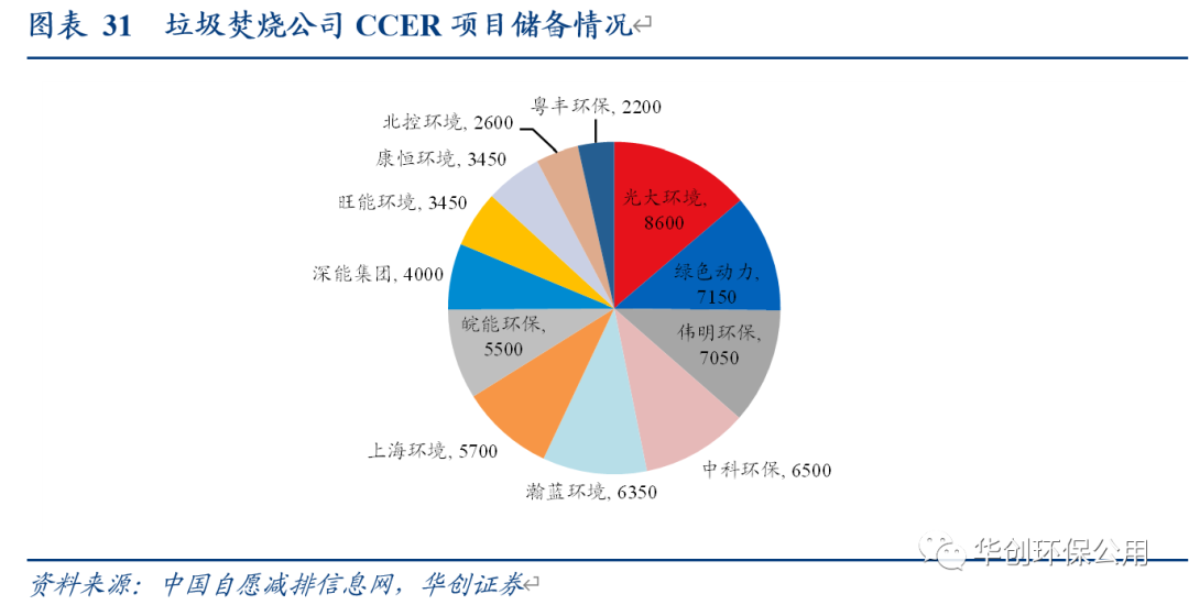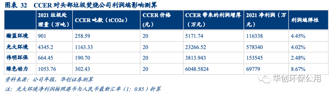 最理想情況下,CCER收入在利潤端可為垃圾焚燒頭部企業(yè)帶來3%-9%的增厚。我們選取瀚藍環(huán)境、光大環(huán)境、偉明環(huán)保和綠色動力四家頭部垃圾焚燒上市公司進行測算,在假設(shè)公司所處理的垃圾全部可以轉(zhuǎn)化為CCER的情況下,按照2021年的垃圾處理量和凈利潤,CCER收入可分別為瀚藍環(huán)境、光大環(huán)境、偉明環(huán)保、綠色動力帶來4.45%/4.02%/2.48%/8.67的利潤端彈性。