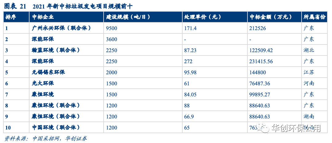 產(chǎn)能視角:行業(yè)步入成熟期,馬太效應明顯。據(jù)不完全統(tǒng)計,2022年1-4月垃圾焚燒新中標項目數(shù)量較去年同期有所提升,但訂單的釋放省份多數(shù)位于中部地區(qū),日處理量超過1000噸僅3個,故新增產(chǎn)能和投資額同比分別下滑;后補貼時代,新中標的垃圾焚燒發(fā)電項目噸垃圾處置費上浮明顯,較2021年平均79.72元/噸增長20.21%。高質(zhì)量項目中標企業(yè)以頭部公司為主,鮮有小公司的身影出現(xiàn),行業(yè)馬太效應繼續(xù)增強。