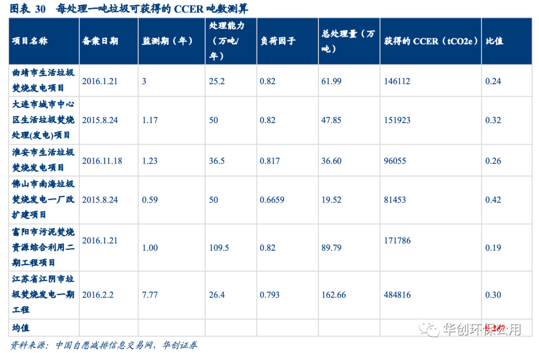 我們采用垃圾處理量與所獲得CCER噸數(shù)之比作為統(tǒng)計口徑,從簽發(fā)和備案項目中選取了較為典型的垃圾焚燒項目計算平均值,根據(jù)測算垃圾焚燒企業(yè)每處理一噸垃圾,平均獲得0.287噸CCER,在假設(shè)CCER價格為20元/噸的情況下,噸垃圾增收約為6元。