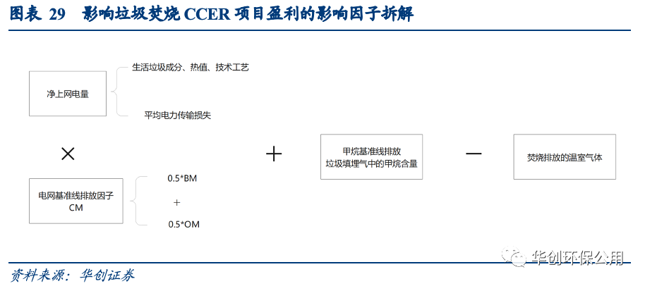 CM-072-V01“多選垃圾處理方式”(第一版)中詳細規(guī)定了測算一個垃圾焚燒項目所產(chǎn)生的CCER噸數(shù)的方法學。與可再生能源發(fā)電項目相比,垃圾焚燒發(fā)電項目不僅替代了項目所在地電網(wǎng)的火力發(fā)電的碳排放,還避免了垃圾填埋產(chǎn)生的甲烷排放;但焚燒化石燃料也會帶來一定的溫室氣體排放。