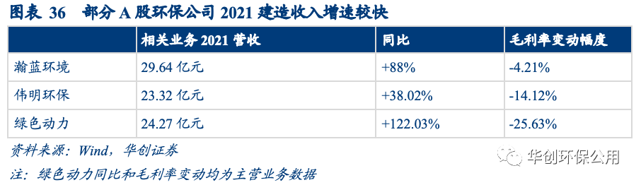 A股主流垃圾焚燒企業(yè)建造收入均出現(xiàn)不同幅度的增長。瀚藍環(huán)境2021年度工程與裝備業(yè)務(wù)營收大幅增長88%,由15.73億增至29.64億元(未剔除內(nèi)部交易),但固廢業(yè)務(wù)的毛利率整體下降4.21pct;偉明環(huán)保設(shè)備、EPC及服務(wù)營收同比增長38.02%至23.32億元,但毛利率卻下降14.12%;綠色動力2021年前不確認建造收入和成本,會計政策變更后確認建造收入24.27億元,總營收大幅增加122.03%至50.57億元,但綜合毛利率卻下降25.63%。垃圾焚燒運營期毛利率遠高于建造毛利率,因此我們認為會計準則的變更在一定程度上可以解釋上述企業(yè)營收增加但毛利率下滑的原因。