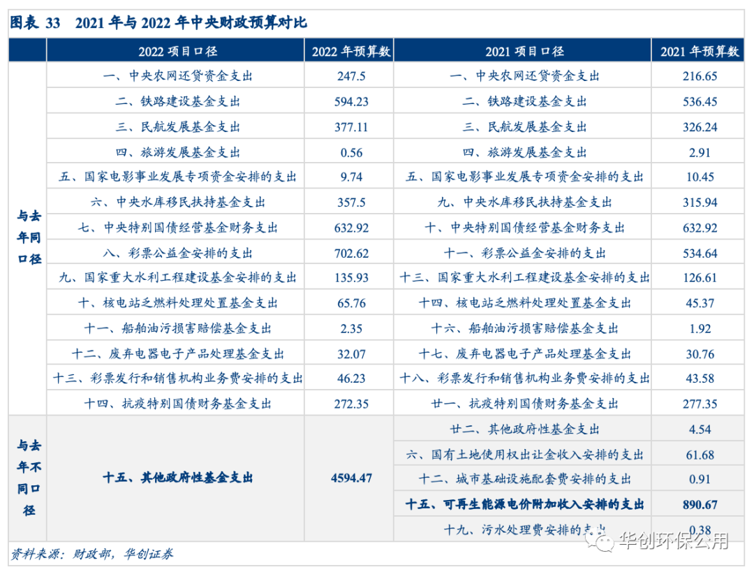 22年政府預算支出中有4500億元的補貼增量或?qū)⒂糜诳稍偕茉囱a貼的一次性發(fā)放。2022年與2021年中央財政預算支出的口徑發(fā)生了變化,其中21年出現(xiàn)的“可再生能源電價附加收入安排的支出”科目在22年的財政支出預算中消失,22年的統(tǒng)計口徑中其他政府性基金支出項目由21年的4.54億元驟增至4594.47億元??紤]到22年將21年的若干個口徑進行合并,假設(shè)除可再生能源補貼項目的其他合并項目預算支出保持不變,預計今年將能騰挪出4500億元的財政支出供可再生能源補貼的發(fā)放,此前的拖欠問題有望得到一次性解決。