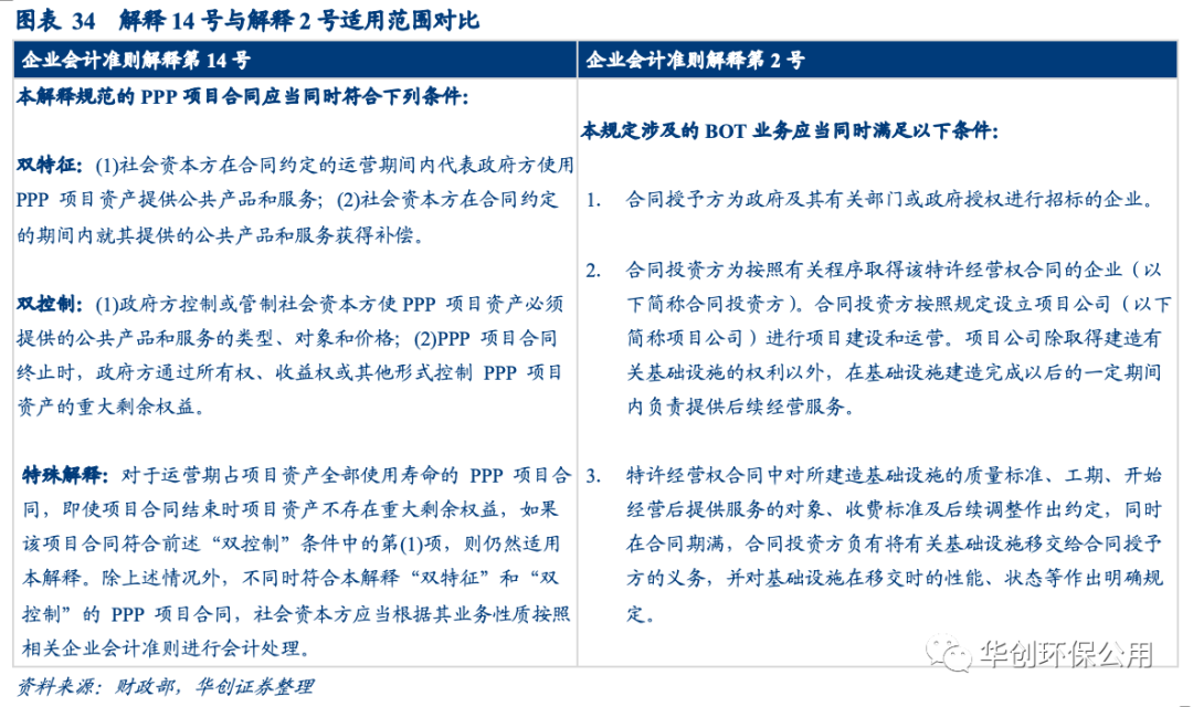 解釋14號對適用范圍做出了更詳細的說明,應當符合“雙控制”與“雙特征”。解釋2號僅對“合同授予方”、“合同投資方”、“特許經(jīng)營權(quán)”等關(guān)鍵名詞做出解釋而解釋14號則對適用范圍做出明確說明——滿足“雙控制”與“雙特征”條件,并對運營期占項目資產(chǎn)全部使用壽命項目、不符合“雙控制”與“雙特征”條件項目的處理方法做出解釋。