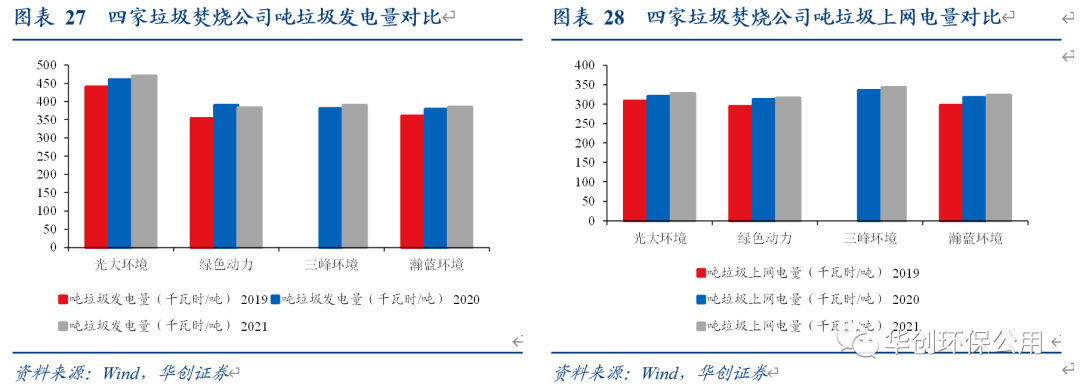 我們選取光大環(huán)境、三峰環(huán)境、瀚藍環(huán)境和綠色動力四家上市公司進行比較,所有公司的2019-2021年的噸垃圾發(fā)電量與噸垃圾上網(wǎng)電量均呈現(xiàn)上升趨勢。2021年光大環(huán)境的噸垃圾發(fā)電量已達到470度,大幅領(lǐng)先其余公司;噸上網(wǎng)電量四家公司差距不大,均在320-340度這一區(qū)間。我們認為噸垃圾發(fā)電量的逐年提升亦可以增厚垃圾焚燒項目的盈利能力,削弱國補退坡的不利影響。