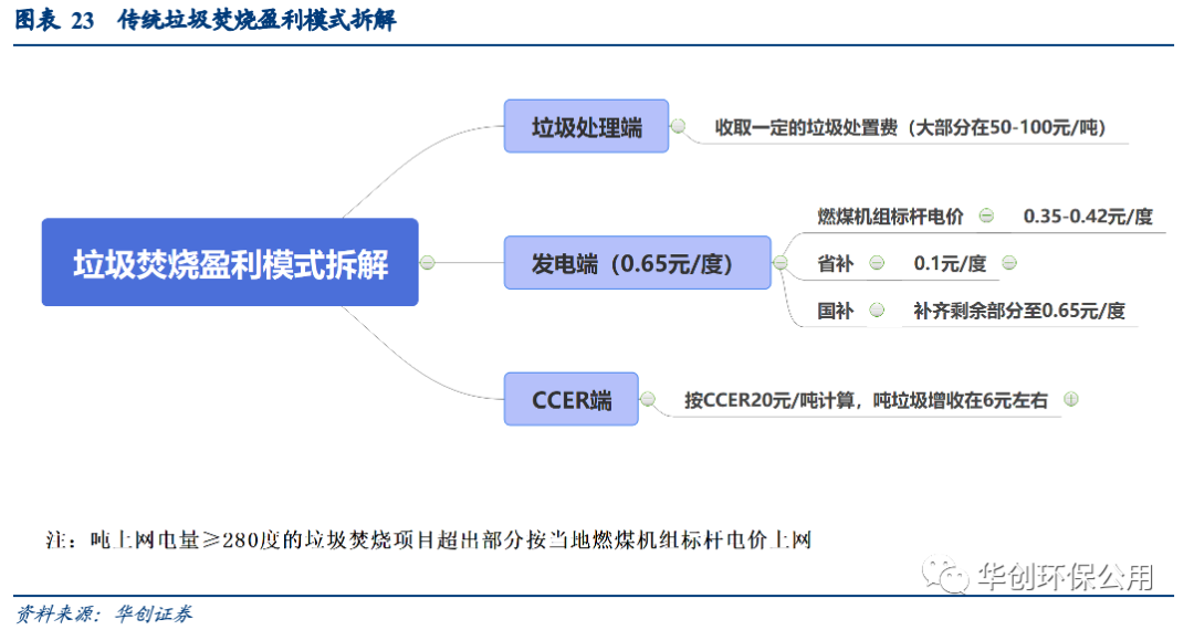 按照傳統(tǒng)盈利模式拆解,噸垃圾上網(wǎng)電量和垃圾處理費是影響垃圾焚燒發(fā)電運營收入的主要因素。理想情況下,垃圾焚燒發(fā)電的商業(yè)模式優(yōu)質(zhì)清晰,處理費主要和項目所在地政府的財政支付能力有關(guān),而噸垃圾上網(wǎng)電量則與公司的技術(shù)手段和垃圾熱值有關(guān)。但近兩年行業(yè)內(nèi)即出現(xiàn)了如國補退坡這樣的擾動因素,也出現(xiàn)了CCER 等利潤增厚因素,此部分我們將詳細剖析各類新變化對盈利因子的擾動情況。