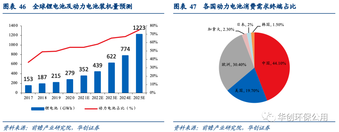 在電動汽車市場快速增長帶動下,動力型鋰離子電池繼續(xù)保持快速增長勢頭。全球動力電池年新增裝機量保持快速增長,根據(jù)前瞻產(chǎn)業(yè)研究院的預測,2025年全球鋰電池裝機量將會達到1223GWh,動力電池占比高達75.2%。2020年中國動力電池終端消費需求高達44.1%,居世界第一位。硫酸鈷和硫酸鎳是生產(chǎn)三元動力電池的重要材料,未來有望量價齊升。