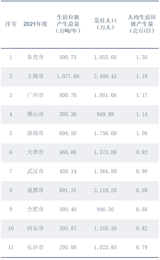 2021年度,11個(gè)重點(diǎn)城市中,人均生活垃圾產(chǎn)生量最高的城市是東莞市,人均每日產(chǎn)生生活垃圾1.30公斤;人均生活垃圾產(chǎn)生量最低的城市是長(zhǎng)沙市,人均每日產(chǎn)生生活垃圾0.79公斤。