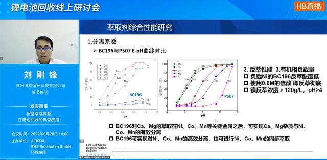 最后,在電池回收濕法工藝弊端凸顯的背景下,新型萃取體系值得期待嗎?這就要聽劉剛鋒技術(shù)總監(jiān)怎么說啦。“使用BC196處理正極溶液得到鎳鈷錳電池級前體相較于傳統(tǒng)流程每噸可節(jié)省10-20%的成本”,從萃取劑綜合性能研究,到鎳鎂分離、鎳鋰分離,再到與現(xiàn)有流程的對比,一應俱全。