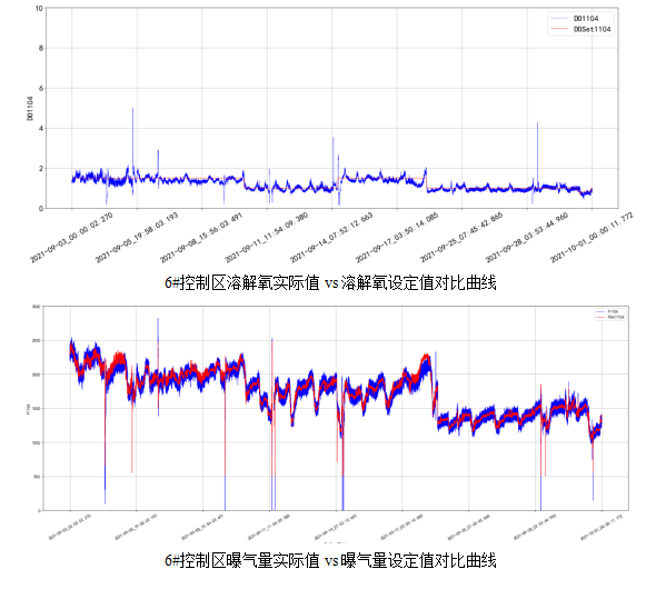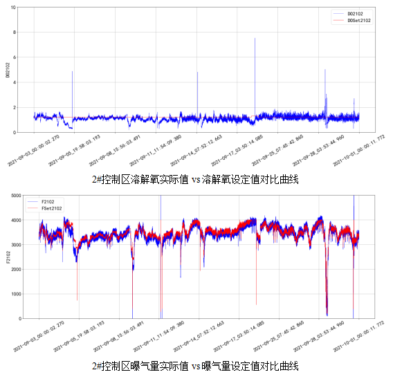 從圖中可看到,使用精確曝氣系統(tǒng)前的生化池溶解氧濃度波動較大,在使用精確曝氣系統(tǒng)后,溶解氧濃度控制平穩(wěn)。