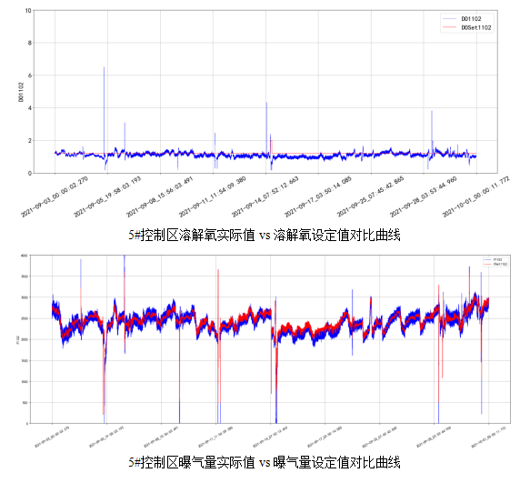 下圖為使用精確曝氣系統(tǒng)后連續(xù)一個月和連續(xù)一周的各溶解氧控制區(qū)溶解氧濃度與氣體流量控制曲線,通過溶解氧控制效果圖可看出,受控溶解氧能夠在設定目標值一定范圍內(nèi)波動,且設定值與實際值吻合度較好,反映不同溶解氧控制區(qū)的溶解氧濃度滿足控制要求。