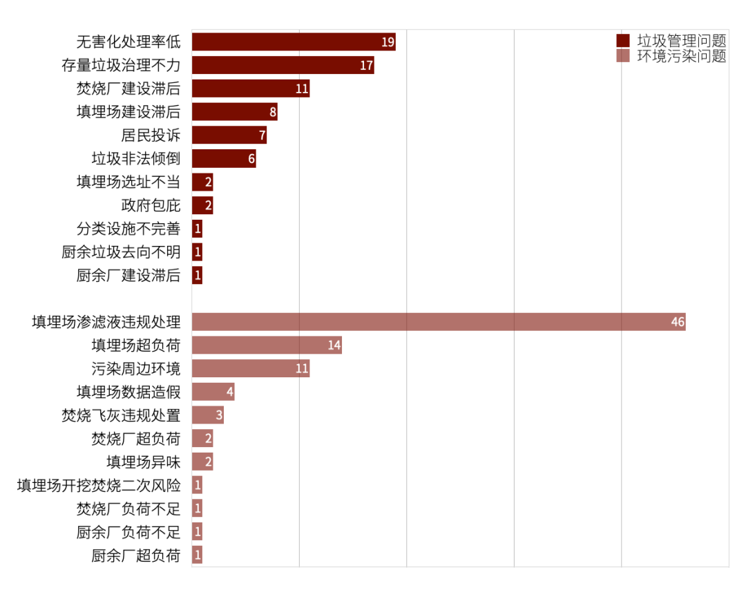 在垃圾管理問題中,無害化處理率低、存量垃圾治理不力、焚燒廠建設(shè)滯后、填埋場(chǎng)建設(shè)滯后等問題表現(xiàn)突出。