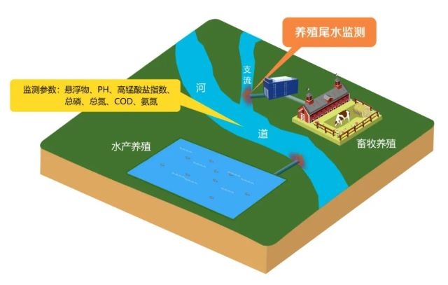 養(yǎng)殖尾水在線(xiàn)監(jiān)測(cè)系統(tǒng)應(yīng)用場(chǎng)景包括水產(chǎn)養(yǎng)殖及畜牧養(yǎng)殖等。主要監(jiān)測(cè)養(yǎng)殖活動(dòng)過(guò)程中產(chǎn)生的向外環(huán)境排放不再使用的廢水。