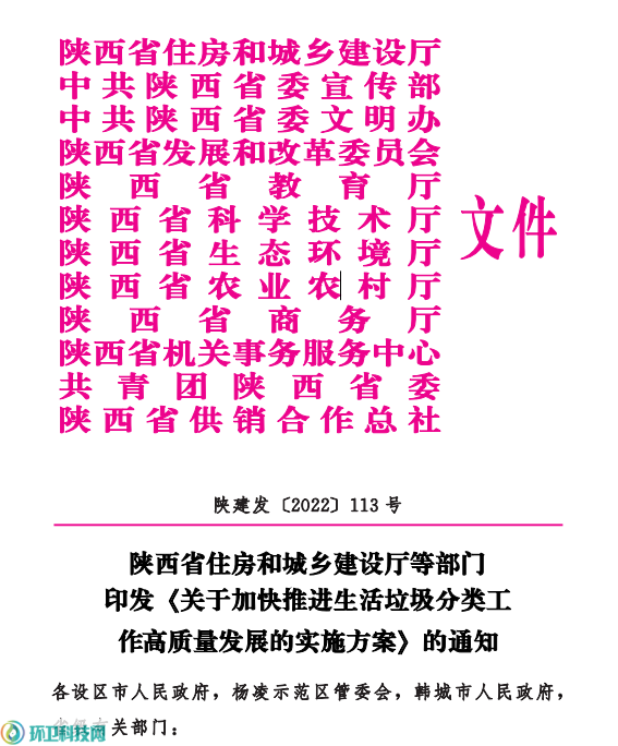 陜西省住房和城鄉(xiāng)建設(shè)廳等部門印發(fā)《關(guān)于加快推進生活垃圾分類工作高質(zhì)量發(fā)展的實施方案》的通知