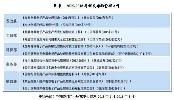 中投顧問發(fā)布的《2017-2021年中國電子廢棄物處理行業(yè)深度調(diào)研及投資前景預(yù)測報(bào)告》指出,我國廢棄電器電子產(chǎn)品回收處理的管理包括再生資源和環(huán)境保護(hù)兩個(gè)領(lǐng)域,涉及電器電子產(chǎn)品的綠色設(shè)計(jì)與制造、再制造、回收、處理和資源綜合利用和處置多個(gè)環(huán)節(jié)。從人大立法、國務(wù)院《廢棄電器電子產(chǎn)品回收處理管理?xiàng)l例》、到主管部委的管理辦法和規(guī)章、標(biāo)準(zhǔn),已經(jīng)形成一個(gè)至上而下的較為完善的管理體系。