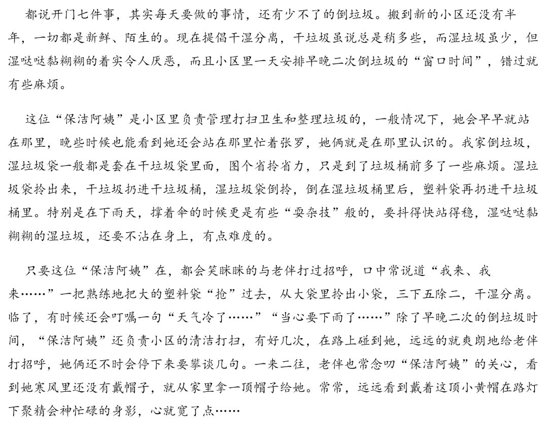 同時,他們也會更認真的一些,比如說之前去。把垃圾桶里的垃圾向外丟的時候呢,從來沒有物業(yè)人員想盡辦法把一桶垃圾啊,能夠壓得更實在一些,這樣呢,可以減少垃圾的運輸?shù)倪@個占用。而現(xiàn)在,垃圾分類之后,采用按桶計量收費,垃圾分類人員就很自覺的想盡辦法把垃圾桶的垃圾壓得更密實一些,比如說用腳踩或其它方式。這樣,讓大家勞動的積極性也提高了很多。我相信,每個人都有了更好的勞動環(huán)境,更受人尊重的這種勞動,更多一點收入的勞動之后,他會提供更好的服務,對我們是這樣,對所有的物業(yè)保潔人員來說也是這樣。