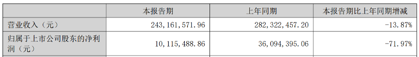 公司上半年度實(shí)現(xiàn)營(yíng)業(yè)收入24,316.16 萬(wàn)元,同比下降 13.87%;實(shí)現(xiàn)歸屬于上市公司股東的凈利潤(rùn) 1,011.55 萬(wàn)元,同比下降 71.97%。