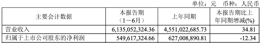 公司上半年?duì)I業(yè)收入為6,135,052,324.36元,同比增長(zhǎng)34.81%;實(shí)現(xiàn)歸屬于上市公司股東的凈利潤(rùn)為549,617,324.66元,同比下降12.34%。