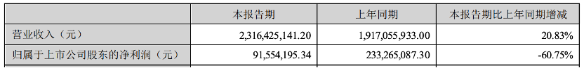 公司上半年?duì)I業(yè)收入為23.16億元,同比增長(zhǎng)20.83%;歸屬于掛牌公司股東的凈利潤(rùn)9155.42萬(wàn)元,同比下降60.75%。
